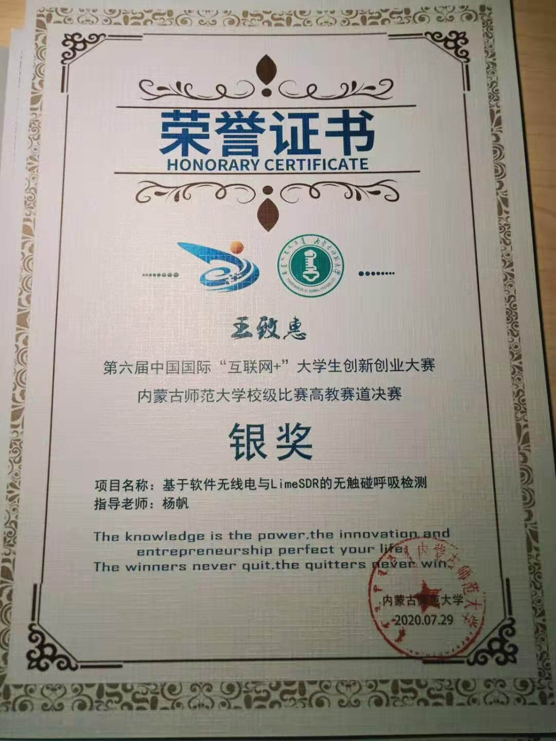 7月30日,第六届中国国际“互联网+”大学生创新创业大赛内蒙古师范大学校级比赛落下帷幕,澳门37000Cm威尼斯2018电子信息工程班王冰《基于SDR与HackRF的无人机截获系统设计》,2018电子信息工程班王致惠《基于软件无线电与LimeSDR的无触碰呼吸检测》,2017电子信息工程2班徐玥辉《基于VCO设计的无人机信号pingbi器》,2017物理学汉班黄菲芸《云理万物》,2018电子信息科学与技术班邹运辉《基于无线电的水位检测报警器》,2017电子信息工程1班潘旭东《青你空间--学生公益服务平台》等6个项目在高教主赛道决赛中分获金、银、铜奖。