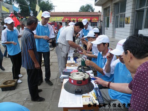 2010年7月9日,澳门37000Cm威尼斯16名学生来到呼和浩特市后桃花村开展暑期“三下乡”送科技活动。活动中,学生志愿者们在实践老师的指导下义务为老乡修理电视机、电风扇、鼓风机等家用电器。志愿者们对送来的家电认真地拆卸、除尘、焊接,短短一天时间就为村民修好了50多件电器。